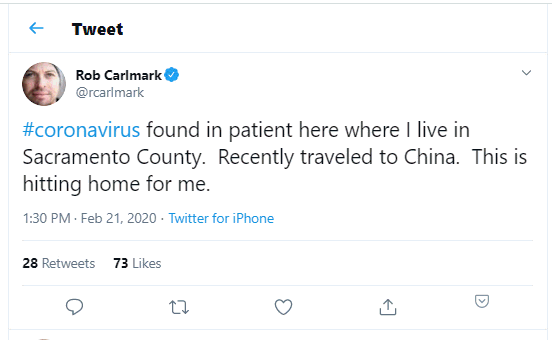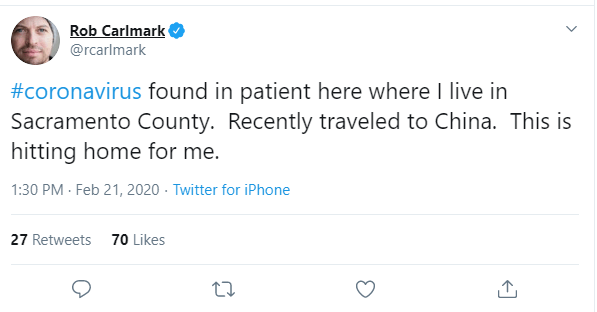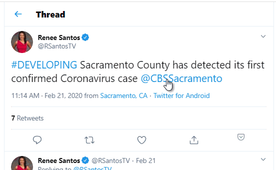 The following source, on the other hand, is likely good to go — a reporter from the Sacramento CBS affiliate reporting on the first case in Sacramento in what seems a professional capacity. Share away!