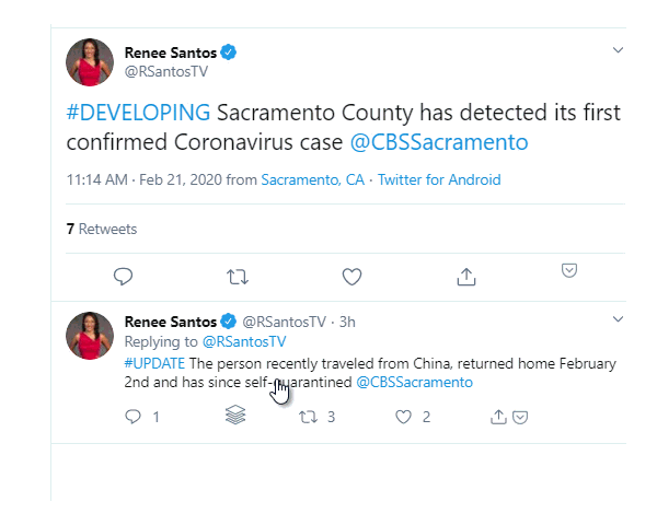 This source, on the other hand, is likely good to go — a reporter from the Sacramento CBS affiliate reporting on the first case in Sacramento in what seems a professional capacity. Share away!